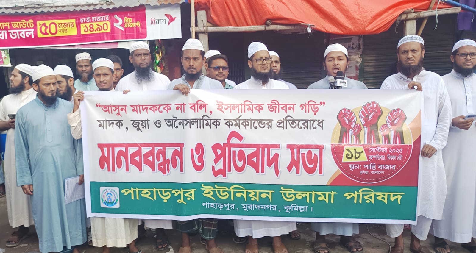 মুরাদনগরে মাদক ও জুয়ার বিরুদ্ধে ওলামা পরিষদের মানববন্ধন ও প্রতিবাদ সভা